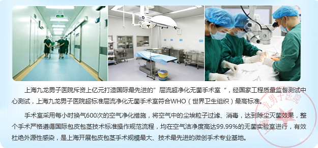 上海九龙男子医院生殖整形诊疗科室:生殖整形是医院男科开展的一个重点精品诊疗科室,开展包皮、包皮过长、鞘膜积液、精索静脉曲张等各类生殖整形诊治工作。拥有雄厚的技术力量,诊疗设备齐全。医院投入巨资建立我国专业的超洁净层流恒温无菌手术室,实现患者无季节限制实施手术的愿望。>>>割包皮较佳年龄是多大?医生为您解答