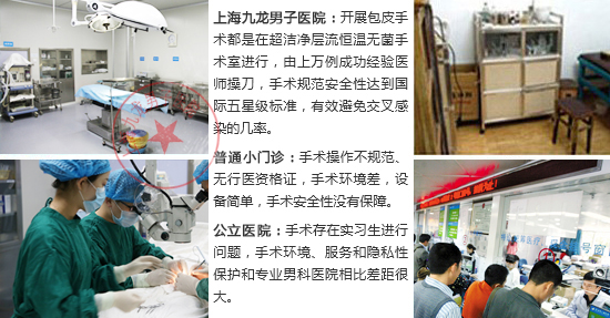 据了解,目前上海开展包皮手术的医院很多,但是开展包皮手术条件却相差很大,患者应选择具有包皮手术开展资质的国家正规男科医院做手术。因为卫生部有关部门在发放许可证前已对医院的各种设施,如手术室面积、无菌环境、手术室内设备及手术大夫的资质和技术进行严格的验收、考核。在这样的医院做手术,患者可以做到四个放心:一是对实施包皮手术室的卫生环境放心;二是对操作包皮手术大夫资质及技术放心;三是对包皮手术的安全性和效果放心;四是对医院收费的正规性和透明度放心。>>>点击了解九龙医院割包皮较好的方法,怎么收费?