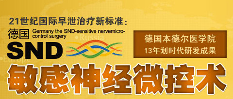 SND敏感神经微控术是国际男科学界一致推荐的治疗早泄的微创性手术,主要结合了敏感神经测定技术、显微定位技术、微创微痛技术,在显微外科定位系统准确定位下,在阴茎背部深度不足2毫米处对多余背神经进行人工抑制,达到调节性神经、性腺轴的功能,从而有效降低生殖器官的敏感程度,让早泄男更持久。