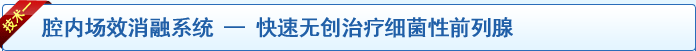 - 腔内场效消融系统利用高频高能聚焦电流场产生的能量,促使组织细胞内离子移动,产生生物效应,对前列腺炎有直达病灶,高效杀菌,畅通腺管,排除毒素,促进腺体功能恢复,达到消炎止痛,组织再生修复的效果。是目前治疗各种细菌性前列腺炎,以及细菌性前列腺炎合并支原体、衣原体、淋菌性尿道炎等尿道感染最理想的治疗方法。 三大优势:1.高效能直达病灶,杀病菌修损组织; 2.通腺管排毒素,通尿路治愈彻底;3.无创安全,高效无痛。